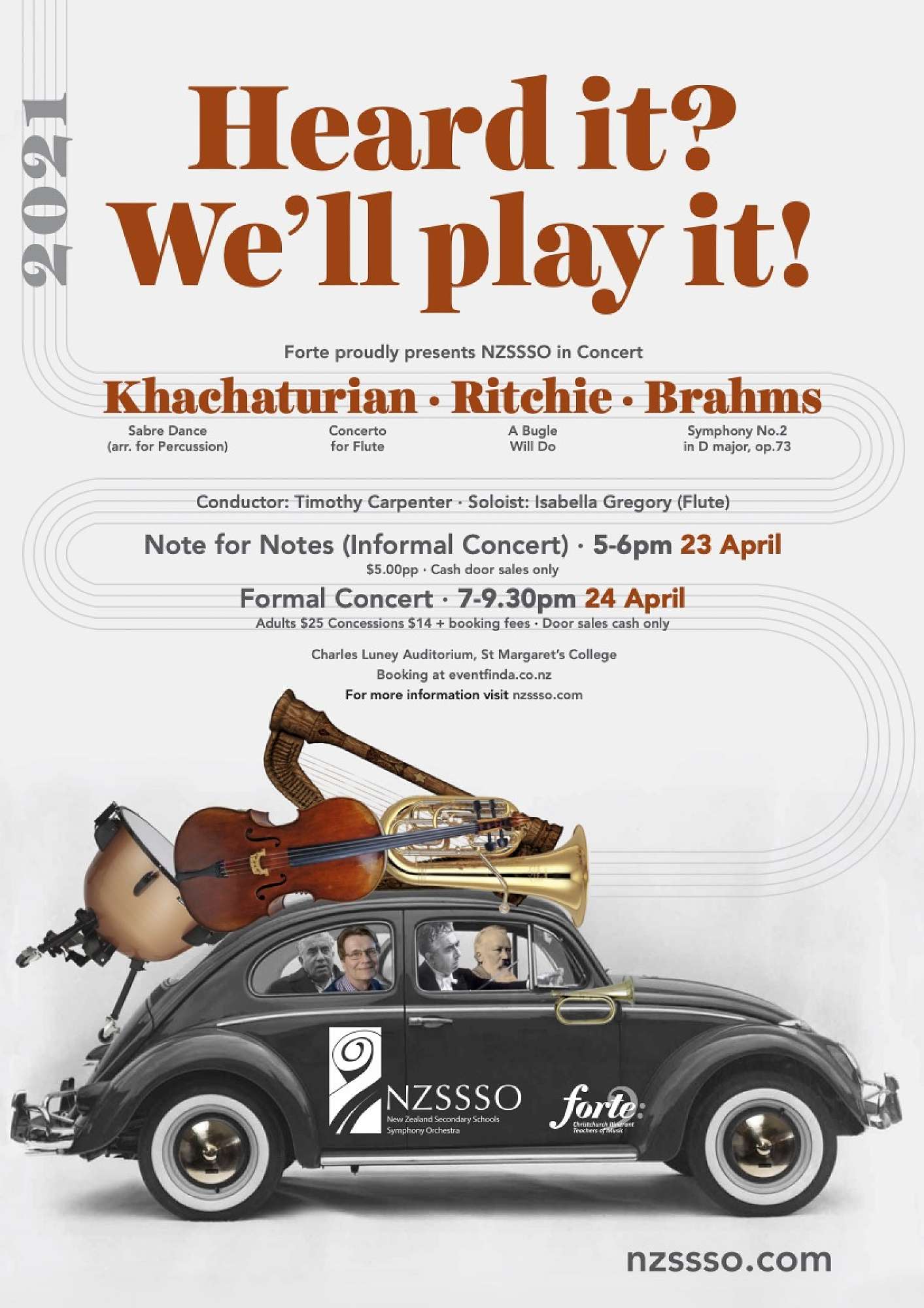 The Formal Concert presents a full concert programme and is an opportunity to be inspired by the talent of our young NZ musicians. It is always a fantastic event and is 7pm-9:30pm on April 24th. Tickets for this at Eventfinda. More info at www.nzssso.com